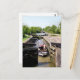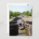 A photographic design of a canal narrowboat that has just entered the lock and waiting for the lock gates to close.