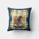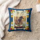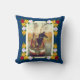 A cushion with a traditionally painted narrowboat canal scene, with autumn coloured leaves in the background and bare trees. The narrowboat is turning around on the canal, a manoeuvre called winding. The painting has a corner border of traditional canal roses From an original photo.