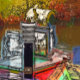An art design of a narrowboat chimney and an old decorated lamp.Canal boats, known in the UK as narrowboats, were originally used to transport goods around the country. They are now used mainly for leisure and attract people from all over the world to enjoy our rural countryside. These boats look very pretty with their brightly colored cabins, traditionally blue, red or green. Flowers and castle designs also adorn the more traditional boats.