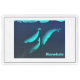 Features three narwhals, Monodon monoceros, swimming under the Arctic ice. Customizable text reading "Narwhals" also appears. The narwhal is related to the Beluga whale and lives in the Arctic year-round. They are found primarily in the waters of Greenland and Canada rarely south of 65°N latitude. Males weigh up to 1,600 kilograms (3,500 lb), females weigh around 1,000 kilograms (2,200 lb). The largest narwhal ever found weighed 3,500 pounds. They are shaped like a beluga and have about four inches of insulating fat. Narwhals normally congregate in groups of about five to ten individuals. In the summer, several groups come together forming larger aggregations. Narwhal is derived from the Old Norse word nár, meaning “corpse”, referring to the animal’s greyish, mottled pigmentation, like that of a drowned sailor. Narwhal are darkest when young becoming whiter with age. The most conspicuous characteristic of the male narwhal is its single 2–3 meter (7–10 ft) long twisted tusk. It is an incisor tooth that projects from the left side of the upper jaw and forms a left-handed helix. The narwhal’s scientific name, Monodon monoceros, is derived from “one-tooth one-horn.” The tusk can be up to 3 meters (9.8 ft) long—compared with a body length of 4–5 meters (13–16 ft)—and weigh up to 10 kilograms (22 lb). About one in 500 males has two tusks, which occurs when the right incisor, normally small, also grows out. A female narwhal may also produce a tusk, but this occurs rarely, and there is a single recorded case of a female with dual tusks. This behavior is thought to maintain social dominance hierarchies. At times, male narwhals rub their tusks together in an activity called “tusking.” The reason for this behavior is unknown; it may be to “scratch an itch,” (the base of the tusk is usually infested with lice); or tusk crossing may be a friendly greeting. The most broadly accepted theory for the role of the tusk is similar to the mane of a lion or the tail feathers of a peacock. It may help determine social rank, maintain dominance hierarchies or help young males develop skills necessary for performance in adul roles. Narwhals have rarely been observed using their tusk for fighting or other aggressive behavior or for breaking sea ice in their Arctic habitat. Narwhal usually proceed at a leisurely pace, slowly breathing and rolling, but are remarkably quick when they feel threatened. Sometimes they travel in small family groups and communicate by means of a great variety of squeals, trills, whistles, and clicks. Narwhals have a relatively restricted and specialized diet. Their prey is predominantly composed of Greenland halibut, polar and Arctic cod, shrimp and Gonatus squid. Additional items found in stomachs have included wolffish, capelin, skate eggs and sometimes rocks, accidentally ingested when whales feed near the bottom. How narwhal catch their prey is unknown. Some scientists believe narwhal stun their prey with sound as do dolphins . Narwhal exhibit seasonal migrations with high fidelity of return to preferred ice-free summering grounds, usually in shallow waters. In the winter, they are found primarily in offshore, deeper waters under thick pack ice, surfacing in narrow fissures in the sea ice, or leads. Narwhal from Canada and West Greenland winter regularly in the pack ice of Davis Strait and Baffin Bay along the continental slope with less than 5% open water and high densities of Greenland halibut. Feeding in the winter accounts for a much larger portion of narwhal energy intake than in the summer and, as marine predators, they are unique in their successful exploitation of deep-water arctic ecosystems. Most notable of their adaptations is the ability to perform deep dives. When on their wintering grounds, the narwhals make some of the deepest dives ever recorded for a marine mammal, diving to at least 800 meters (2,400 feet) over 15 times per day with many dives reaching 1,500 meters (4,500 feet). Dives to these depths last around 25 minutes, including the time spent at the bottom and the transit down and back from the surface. In the shallower summering grounds, narwhals dive to depths between 30 and 300 meters (90–900 feet). The only predators of narwhals besides humans are polar bears and orcas. Inuit people are allowed to hunt this whale species legally for subsistence. The northern climate provides little nutrition in the form of vitamins which can only be obtained through the consumption of seal, whale, and walrus. Almost all parts of the narwhal, meat, skin, blubber and organs, are consumed. Mattak, the word for raw skin and blubber, is considered a delicacy, and the bones are used for tools and art. In some places in Greenland such as Qaanaaq, traditional hunting methods are used, and whales are harpooned from handmade kayaks. In other parts of Greenland and northern Canada high-speed boats and hunting rifles are used. While populations appear stable, the narwhal has been deemed particularly vulnerable to climate change due to a narrow geographical range and specialized diet. Narwhals that have been brought into captivity tend to die quickly. In Inuit legend the narwhal’s tusk was created when a woman with a harpoon rope tied around her waist was dragged into the ocean after the harpoon had struck a large narwhal. She was transformed into a narwhal herself, and her hair, that she was wearing in a twisted knot, became the characteristic spiral narwhal tusk. Some medieval Europeans believed narwhal tusks to be the horns from the legendary unicorn. As these horns were considered to have magic powers, such as the ability to cure poison and melancholia, Vikings and other northern traders were able to sell them for many times their weight in gold. The tusks were used to make cups that were thought to negate any poison that may have been slipped into the drink. During the 16th century, Queen Elizabeth received a carved and bejeweled narwhal tusk f