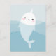 Postcard featuring an illustration of a cute narwhal swimming in the sea among blue waves.