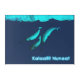 Three narwhals, Monodon monoceros, under the polar ice. Text reading, "Kalaallit Nunaat," the word for Greenland in Kalaallisut, the primary dialect, appears in glowing blue and white.