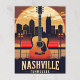 A retro-style travel poster for Nashville, Tennessee, features a large acoustic guitar in the foreground, with the city's skyline silhouetted against a vibrant sunset. "NASHVILLE" is prominently displayed above "TENNESSEE" at the bottom.