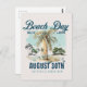 National Beach Day is August 30th. Celebrate with this retro-poster style design with the beach, palm trees, surfboard, and a pelican.