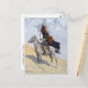 "The Blanket Signal" depicts a Native American Apache warrior on a hillside raising a red, black, and white blanket in his hand as a signal.