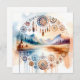 Vibrant watercolor artwork featuring a serene landscape with mountains and a calm lake at sunrise. In the foreground, include a traditional teepee and a small cabin, surrounded by lush trees. The scene with intricate tribal patterns, including dreamcatchers, feathers, and geometric shapes, incorporating warm earth tones and soft watercolor effects to enhance the dreamy atmosphere. The overall look evokes a sense of harmony with nature and indigenous culture.