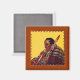 This vintage image has an elder Native American dressed in traditional clothing smoking a peace pipe. The background is yellow with a brown border.