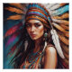 A native american woman with a serious expression wears a vibrant headdress adorned with colorful feathers. Her attire is complemented by layered necklaces and earrings, creating a striking and intricate look.