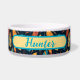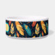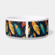Bright and colorful Southwest, Native American Style pet bowl features turquoise blue, orange, yellow and rust colored feathers against a black background. In the center is a peach colored banner where you personalize with your dogs name.