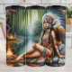 A serene Native American woman, adorned in an elaborate feathered headdress and intricate jewelry, sits gracefully by a calm river. A majestic bald eagle perches beside her, wings slightly spread. A warm campfire glows in the foreground, while lush willows and distant trees create a peaceful, mystical twilight scene, embodying harmony with nature.