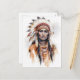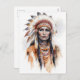 This is a striking watercolor-style portrait of a woman, depicted with features and attire often associated with Indigenous cultures. She wears an elaborate feathered headdress with a prominent red and patterned band. Her long, dark hair is styled in braids that fall over her shoulders. Around her neck, she is adorned with numerous strands of colorful beaded necklaces in earthy tones like orange, red, and light blue. Her expression is solemn and direct, with dark, intense eyes. The background is a soft, undefined wash of warm, light brown and orange tones, characteristic of watercolor painting, making her stand out.