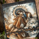 A Native Indian woman adorned in traditional attire sits pensively beside a magnificent wolf, framed by a tranquil body of water. The soft glow of a fire nearby casts warmth, creating a serene atmosphere as nature surrounds them.