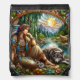 Native Indian woman peacefully rests with a wolf Drawstring Bag