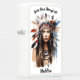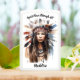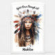 A striking portrait of a Native Indian woman showcasing traditional attire. Her serene expression is highlighted by a vibrant feather headdress, surrounded by a blend of earthy colors and patterns.