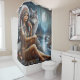 Native woman relaxes by river with wolf shower curtain