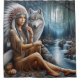 Amidst cascading water and lush greenery, a Native Indian woman adorned in traditional attire rests by a riverbank. Beside her, a majestic wolf gazes intently, embodying the deep connection between nature and spirit