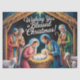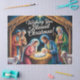 A classic and reverent illustration of the Nativity scene, featuring Mary and Joseph kneeling beside the baby Jesus sleeping in a manger under the Star of Bethlehem. The scene, set inside a stable, is rounded out by the presence of shepherds and small lambs, conveying the traditional Christmas story. The image includes a festive greeting in script reading, "Wishing You a Blessed Christmas!".