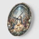 This solemn clock depicts a beautiful Nativity scene, with Mary and Joseph kneeling by the Baby Jesus in the manger, surrounded by shepherds and lambs. The stable is framed by a rustic stone archway, with a bright star and angels shining above. The border is decorated with festive garlands, ornaments, and pine sprigs. The design may look real due to the high detail and three-dimensional texture in the artwork.