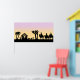 This is a long, panoramic artwork of a sunset-hued sky over silhouettes of the Nativity. The images include the stable with the Baby Jesus, shepherds and the Wise Men approaching.