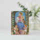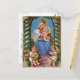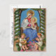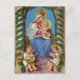 lovely vintage watercolor painting with madonna and child. the madonna is sitting on a golden colored throne wearing a long blue and red dress, white shoulder scarf with gold stars, white headdress, crown on her head, gold halo, and holds the baby jesus in her arms, who has a golden radiating halo around his head. two infant angels sit in front and one is playing the mandolin, the other is playing a small trumpet, and both are wearing white dresses with gold trimmings, at the madonna's feet and around the angels are pink roses on the ground, and two classical columns with green flora entwining around them and archway framing the madonna and child. christian vintage painting in in pinks and blues.