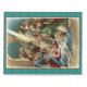 vintage painting of nativity scene with madonna and child, joseph, three wise men with gifts, and crowds of people outside, with a lovely ray of light beaming on the baby jesus who has his hand raised in a greeting.