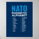 Modern blue design featuring the complete phonetic alphabet from Alfa to Zulu.
