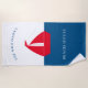 Stunning nautical red white and blue beach towel featuring a red boat on a white and blue colorblock background , with a two text templates where you can add your family name and boat house , summer home or even cottage , very easy to personalize and make it your own.