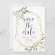 Beautiful green and gold wedding save the date cards feature gray lettering framed by a faux gold geometric border and light green watercolor foliage, leaves, and white berries. Personalize with your names, wedding date, and location, and add any additional information, like your wedding website, to the reverse side. A modern choice in a natural color scheme for boho, woodland, or nature themed weddings in any season.