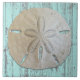 Sand dollar decorative tile with blue wood background. Rustic decor for a seaside home. The tile comes in two sizes.