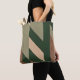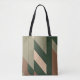 This tote bag boasts a bold, abstract design with sweeping diagonal lines in earthy shades of green, beige, and soft browns. The layered, angular shapes create a dynamic, almost chevron-like pattern that adds movement and flow to the design. The color palette evokes natural elements, making it a stylish and versatile accessory perfect for everyday use. Its minimalist yet impactful design gives off a modern vibe while staying true to a nature-inspired theme, making it a subtle statement piece for casual outings.