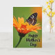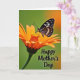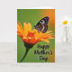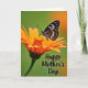 The front design shows a close-up scene of a black butterfly with white spots and soft brown-cream markings resting on a sunlit orange flower, its wings angled as if leaning in for a tender moment ❤️. Its slim antennae curve upward while it hovers near the flower’s golden center, where fine, textured filaments create a cozy, intimate focal point. Gentle natural light highlights the velvety wing surfaces and the layered petals, giving the pair a quiet, affectionate closeness like old friends sharing a pause. The background fades into a smooth blur that shifts from leafy green to a warm orange glow, keeping attention on the butterfly and bloom 🌼. In the lower right, the message “Happy Mother’s Day” sits neatly, written in a flowing handwritten look in a dark tone that stands out without overpowering the image. The text placement leaves the butterfly and flower as the main focus, while still making the greeting easy to spot at a glance. Behind them, the soft bokeh gradient moves from green on the left to orange on the right with no sharp edges.