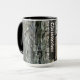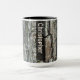 Opposite of mug's handle, there is a vertical semitransparent name banner. Banner is black and text is light. Text can easily be customized or rearranged. You can also adjust text font, size and color.