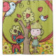 Shower curtain features a little girl princess with crown in a forest with nature including blue and red birds, a red and blue polka dotted deer, tree, and flowers.