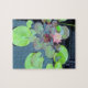 This nature scene puzzle features a pond that has several lily pads floating gently on the water's surface. A cute green frog is sitting on one of the lily pads and a pink flower is in the middle of the picture. This scenic jigsaw puzzle is a perfect way to entertain children and adults alike. Choose how many pieces you want your puzzle to have to customize how difficult or easy you want to make your jigsaw. The finished puzzle can make a lovely piece of nature art for your home and the outdoorsy image will remind you of lazy summer days spent enjoying the sun. The puzzle was adapted from a digital photograph taken by the designer.