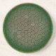Framed with wood, this round stone tile ball has moss growing between it and the wooden frame.