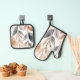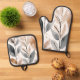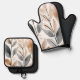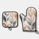 This oven mitt and pot holder set features a modern art abstract boho-style image. The image includes several botanicals in neutral shades of muted tan or beige and gray on a white background. Available as a set or for purchase individually, these contemporary styled kitchen essentials will add a touch of nature to your home.