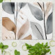 This kitchen towel features a modern art abstract image of several botanicals in neutral shades of muted tan or beige and gray on a white background.