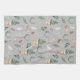 Beautiful wintery pattern for your seasonal holiday decor features watercolor illustrations of pine cones, evergreen branches, leaves, wreaths, stockings stuffed with foliage and sweet potted Christmas trees on light gray background.