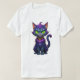 A vibrant, cartoonish cat with spiky purple and blue fur, bright green eyes, and a mischievous grin. It's adorned with a golden collar, exuding a playful and charming personality.
