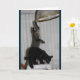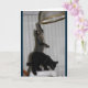 This funny birthday card features a gray striped kitty named Caspian and a black kitty named Mauser. It shows these two curious kitties getting into mischief. Mauser is crawling all over a cat carrier that had been placed on the dining room table. Caspian is on top of the cat carrier and standing up on her hind feet reaching for and pulling down on the dining room lamp hanging from the ceiling. A funny birthday card that says, "Don't do anything your cat wouldn't do! Happy Birthday."
