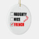 Naughty Nice French funny Santa checklist featuring a cartoon candy cane. A great design for a French household. Funny Christmas gift.