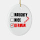 Naughty Nice German Santa Checklist featuring a cartoon candy cane. A funny Christmas ornament for a German household.