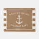 A doormat featuring a nautical anchor and the custom name of the boat owner and boat. On the sides are khaki brown and white stripes to complement the front text.