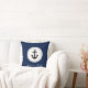 This throw pillow offers a stylish nautical design. A white circle with a rope border accented with an anchor appears on a navy blue background. Handwritten style text, appears near the bottom, for you to add your family name.