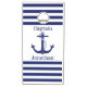 This nautical design feature a drawing of a navy blue anchor with rope in the center. One Board has "Captain" and the other board has "First Mate". Each board has a name for you to personalize along with navy blue and white stripes above and below.