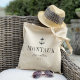 Welcome guests to your destination wedding with these chic and modern personalized tote bags. Design features a nautical anchor illustration in dark navy blue with your wedding destination beneath (shown with Montauk, New York) in classic serif lettering. Add your names beneath in handwritten cursive script, as well as the year. Colors can be changed to match your wedding colors using Zazzle's design tool.