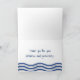 A thank you card with a nautical theme. Designed with watercolors, the background is an ethereal aqua green and the image on the front is an anchor in a reddish pink and green color with a twirling rope, and a seashell at its base. The inside has a wavy blue border at the bottom with a message inside which you can customize to suit your needs.
