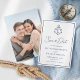 This elegant minimalist nautical wedding save the date card features an anchor monogram at the top with the initials of the bride and groom, with a simple white background and navy blue text, and a photo template on the back.