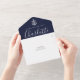 An all-in-one wedding invitation featuring a ship's anchor and elegant signature script name and monogram initials on a navy blue background. The invitation includes a perforated RSVP card that can be individually addressed or left blank for you to handwrite your guest's address details. Designed by Thisisnotme©