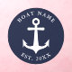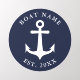 This round nautical wall decal is easy to personalize with the boat name, year, or another text. The design features a white anchor and text templates on a navy blue background that imitates a stamp. Larger sizes are also available.